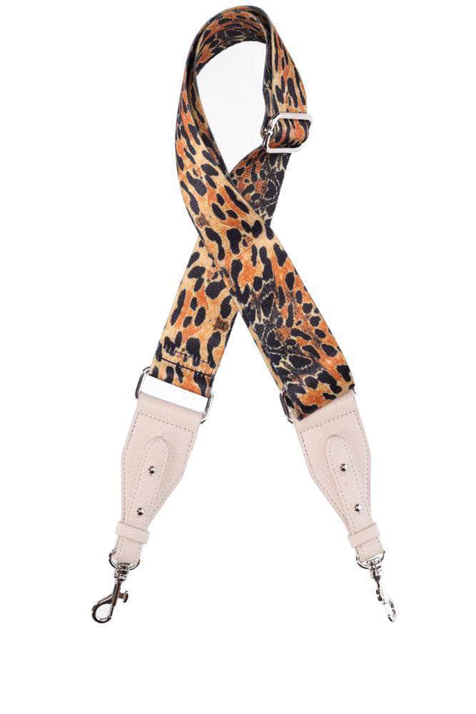A leopard print adjustable woven bag strap with faux leather, and silver hardware clasps