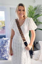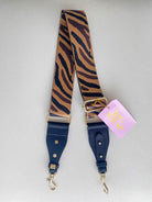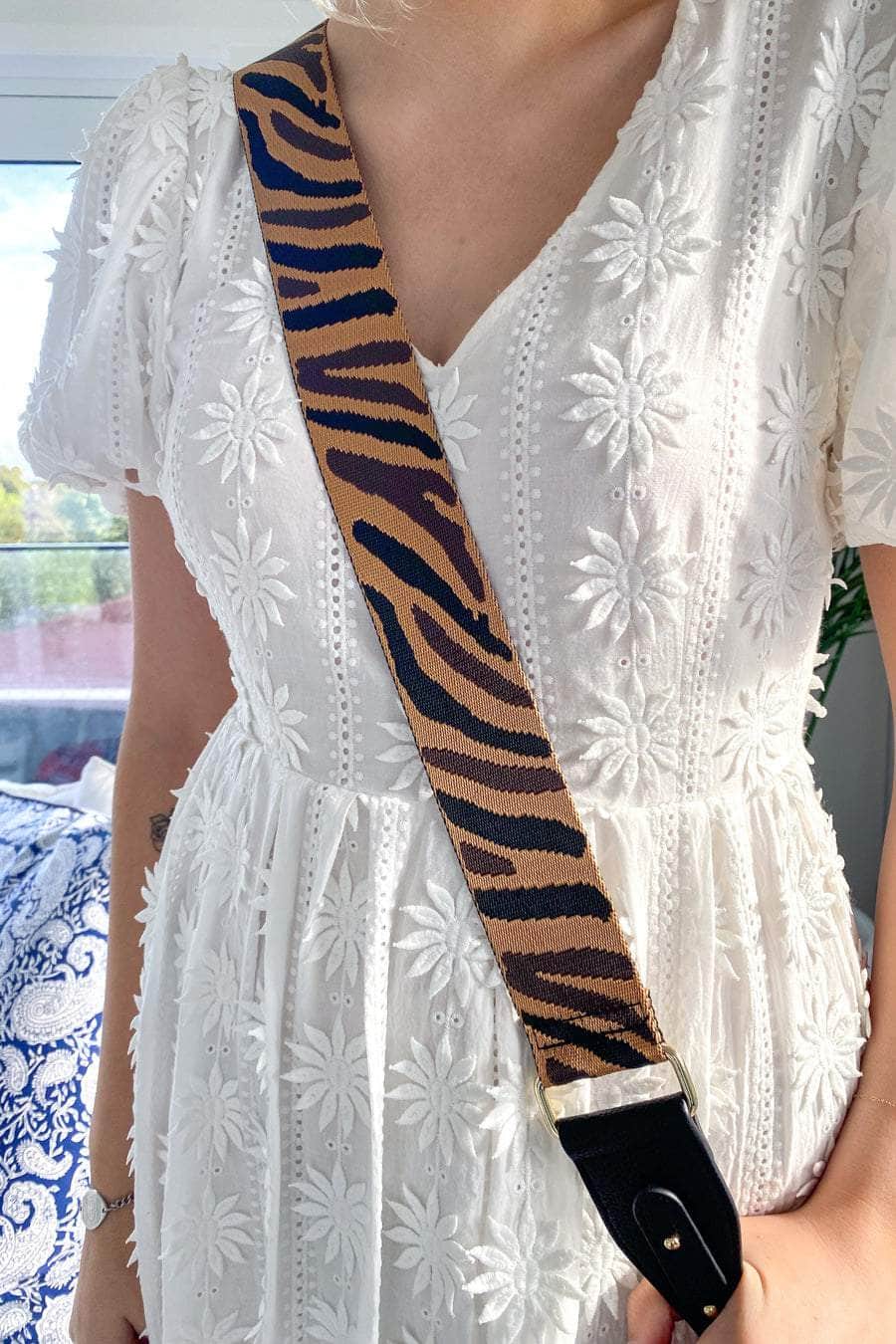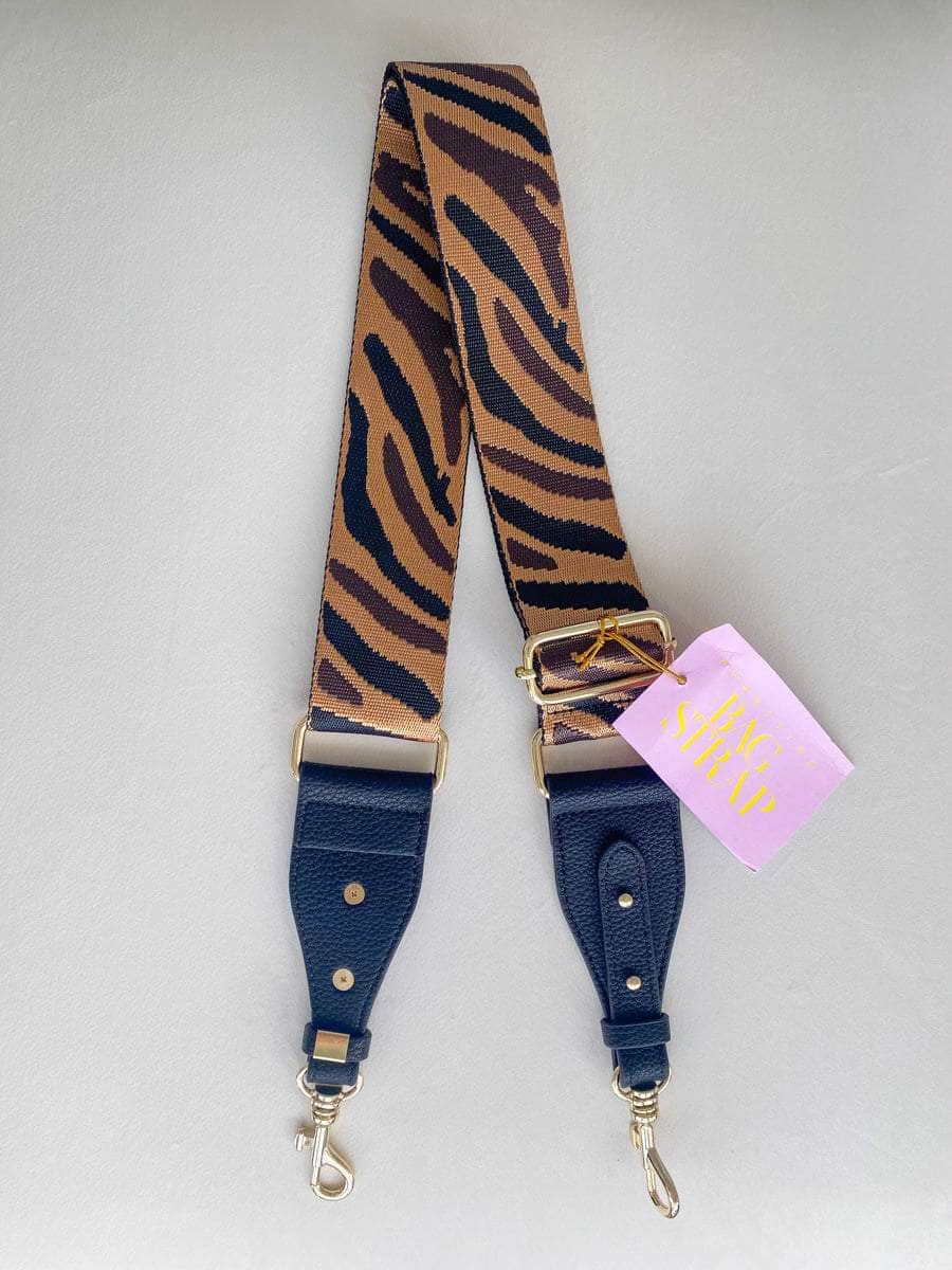 A zebra print adjustable woven bag strap with faux leather, and gold hardware clasps