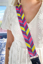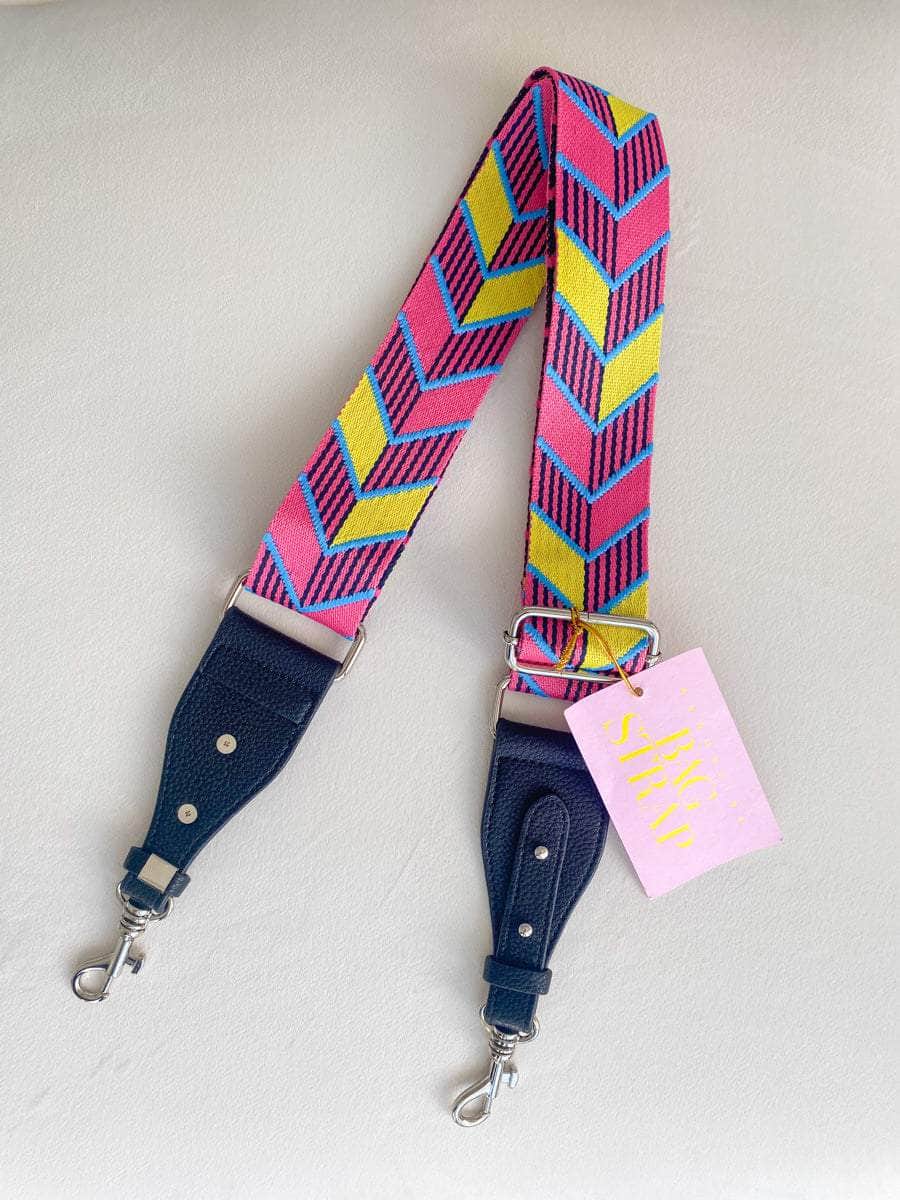 A pink and yellow adjustable woven bag strap with faux leather, and gold hardware clasps
