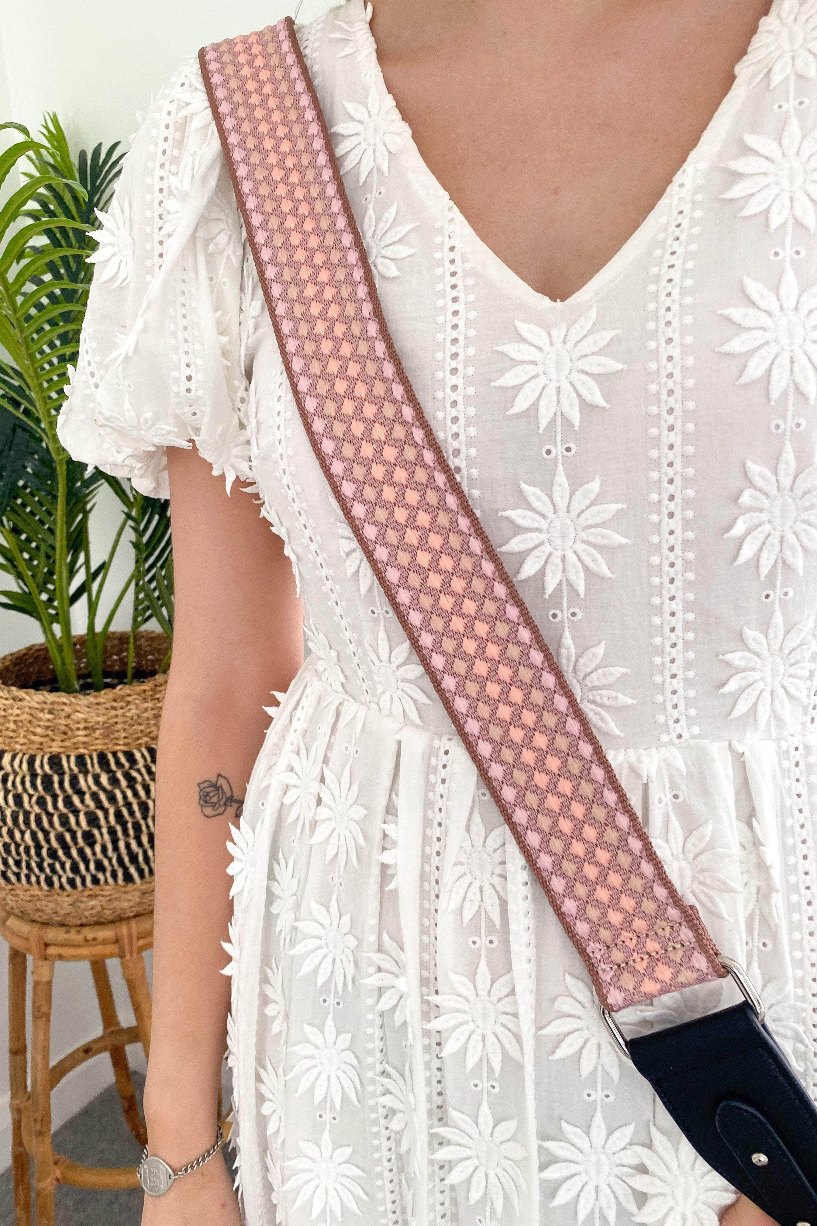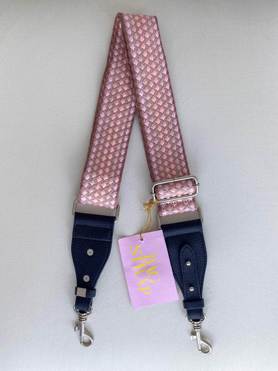 A pinky adjustable woven bag strap with black faux leather, and silver hardware clasps