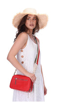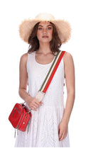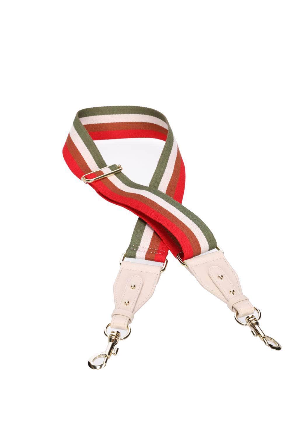 A gorgeous striped adjustable woven bag strap with cream faux leather clasp ends