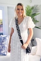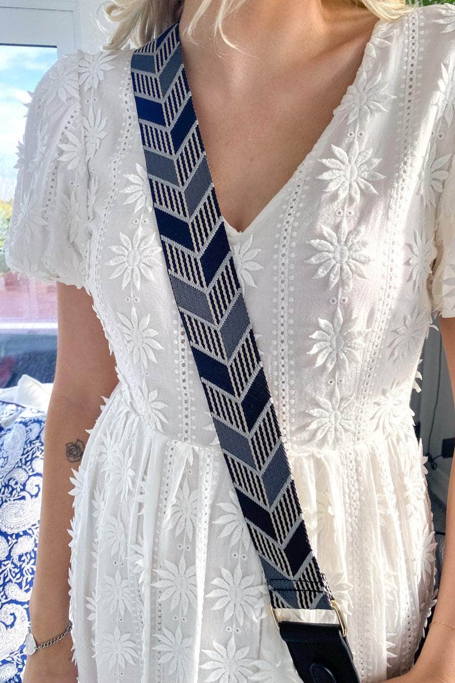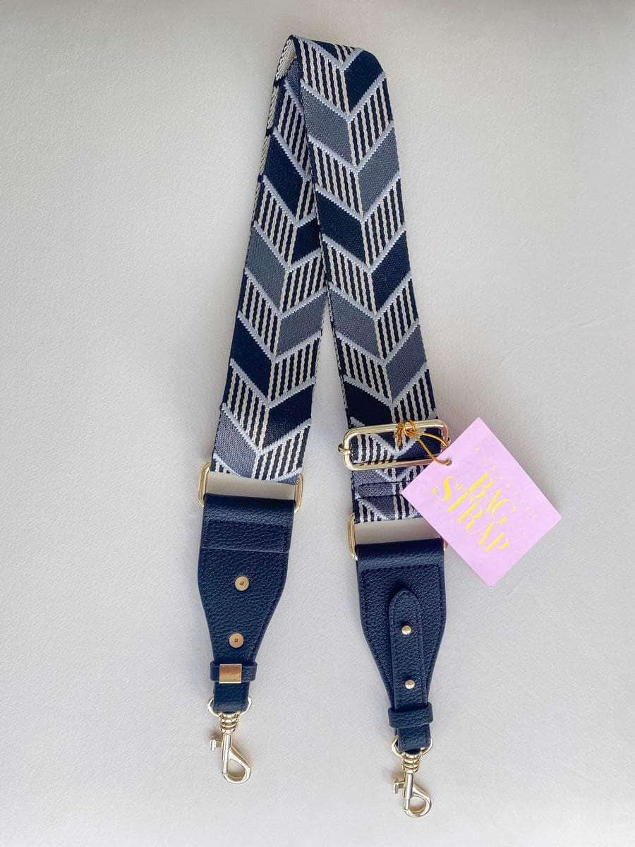 A blue attract print adjustable woven bag strap with faux leather, and gold hardware clasps