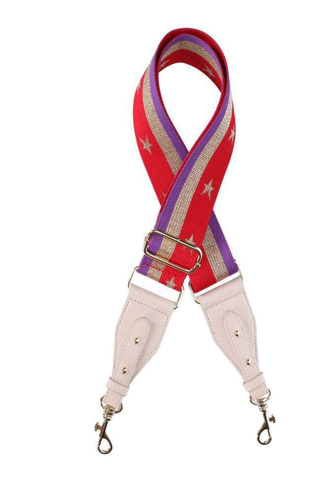 A red and purple adjustable woven bag strap with gold stars, faux leather and gold hardware clasps