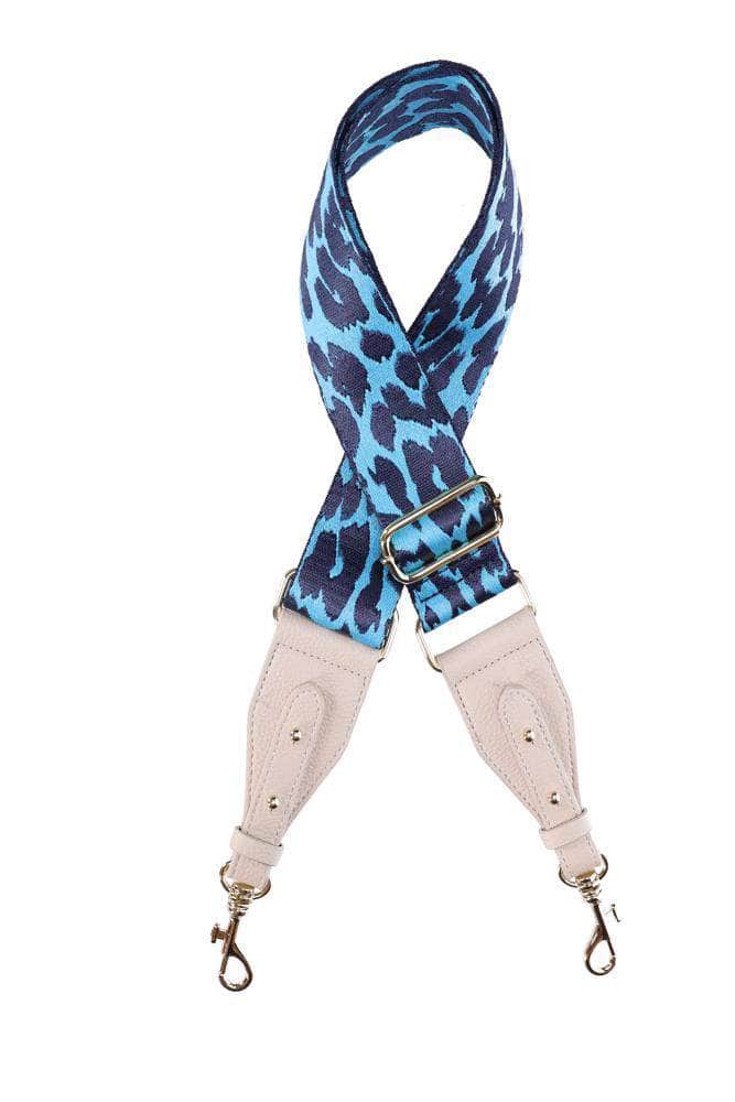 A blue leopard adjustable woven bag strap with faux leather, and silver hardware clasps