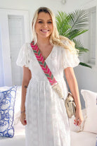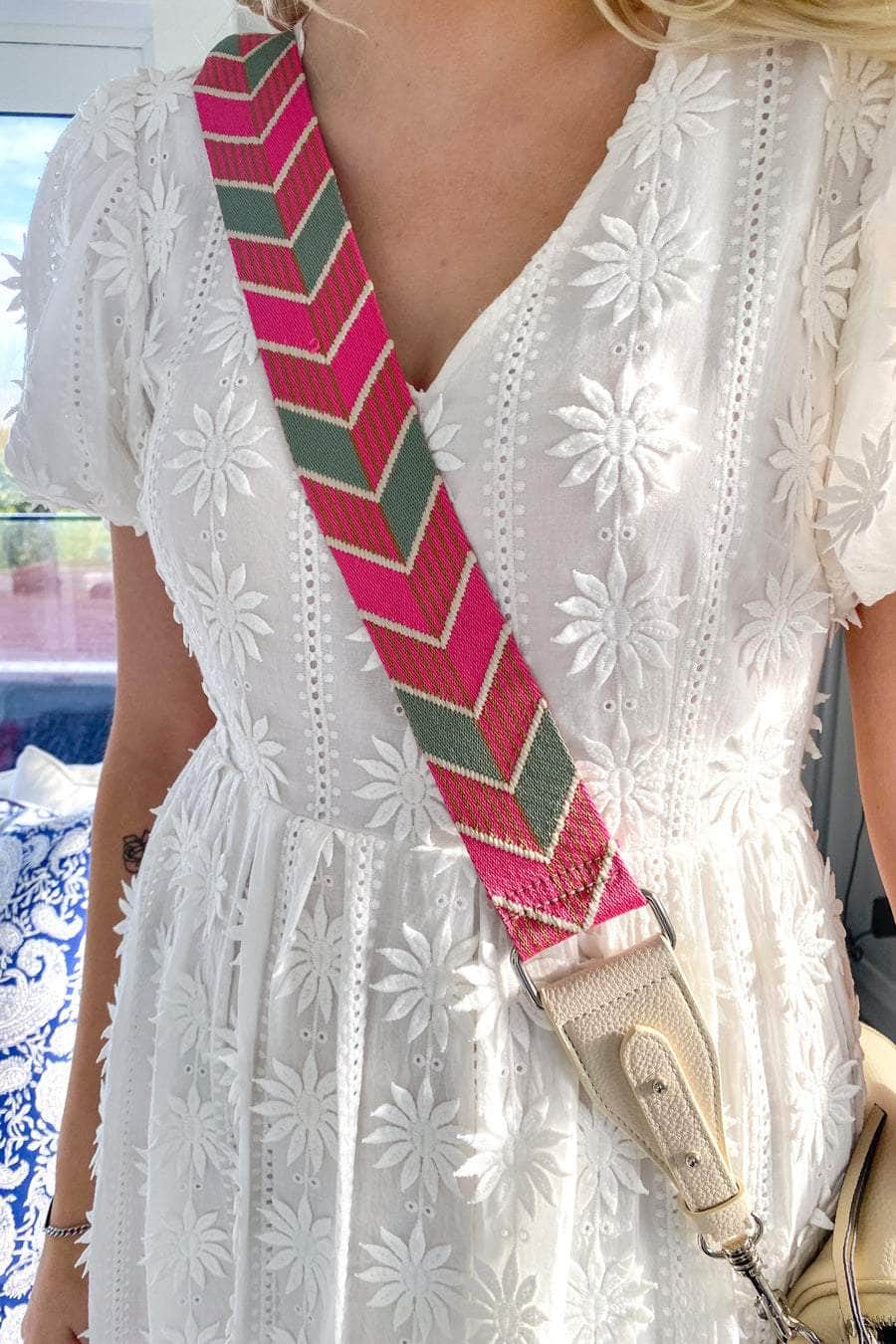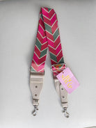 A pink and green adjustable woven bag strap with faux leather, and silver hardware clasps