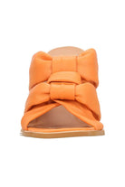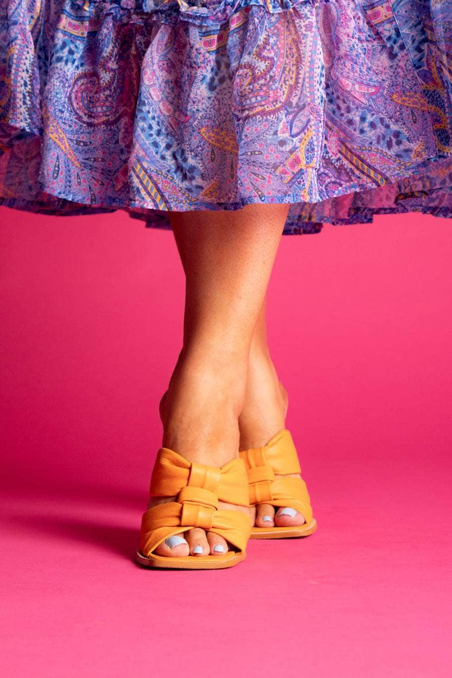 An orange leather block heel with bow straps.