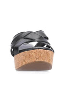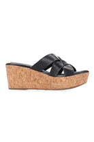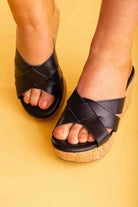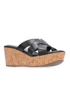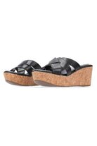 A black leather crossover strap wedge heel.