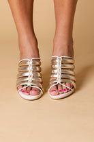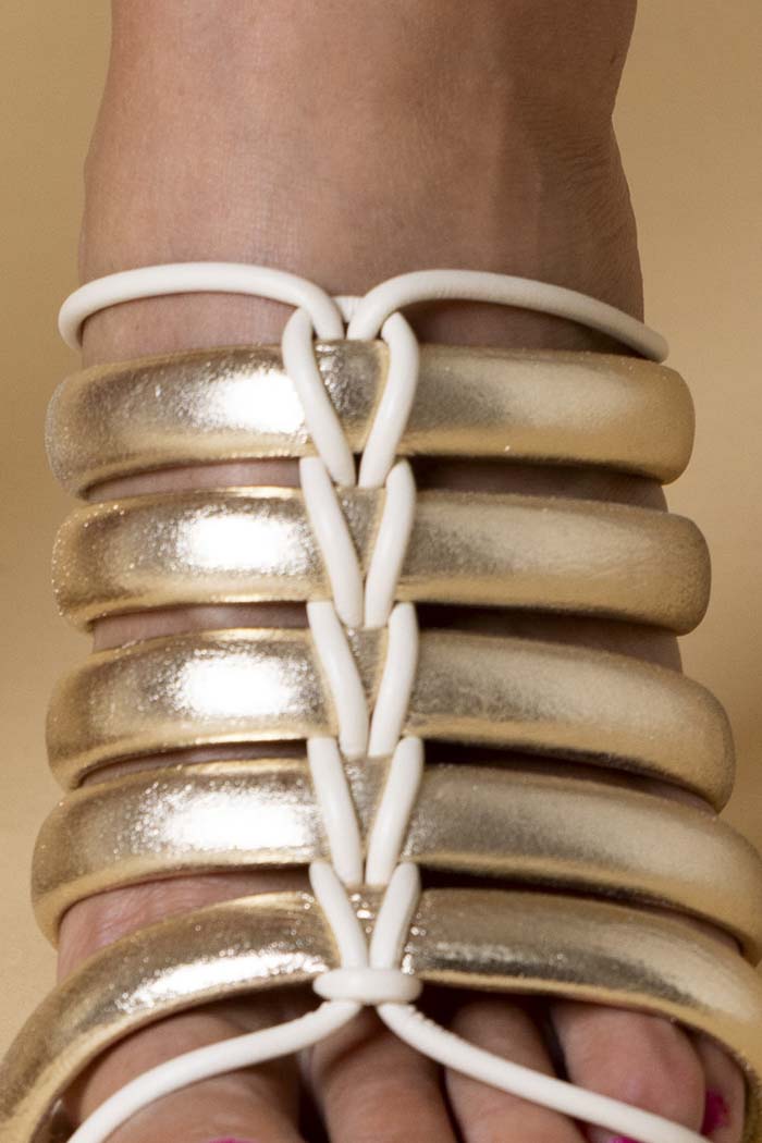 A thick gold strap multi strap heel with a thicker white heel and plaited design.