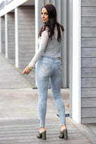 Mid-rise light blue stretch denim with rips, heavy stonewash , panelling along front, ruching around knee panel and ankle zippers