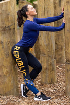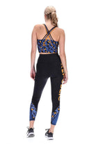 A black full length legging with blue leg panels.