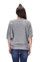 Features: Batwing sleeves, elbow length sleeves, asymmetric left side seam