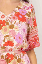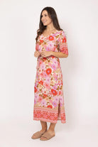A boho print maxi dress with a rope tie to synch in at the waist.