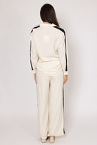 A soft cream pant with black stripe down the side.