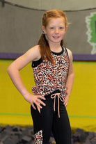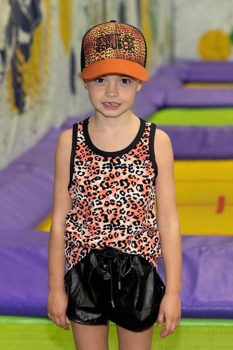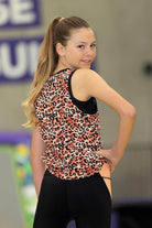 A ribbed peach leopard print singlet top with black binding around the neckline and armholes.