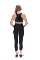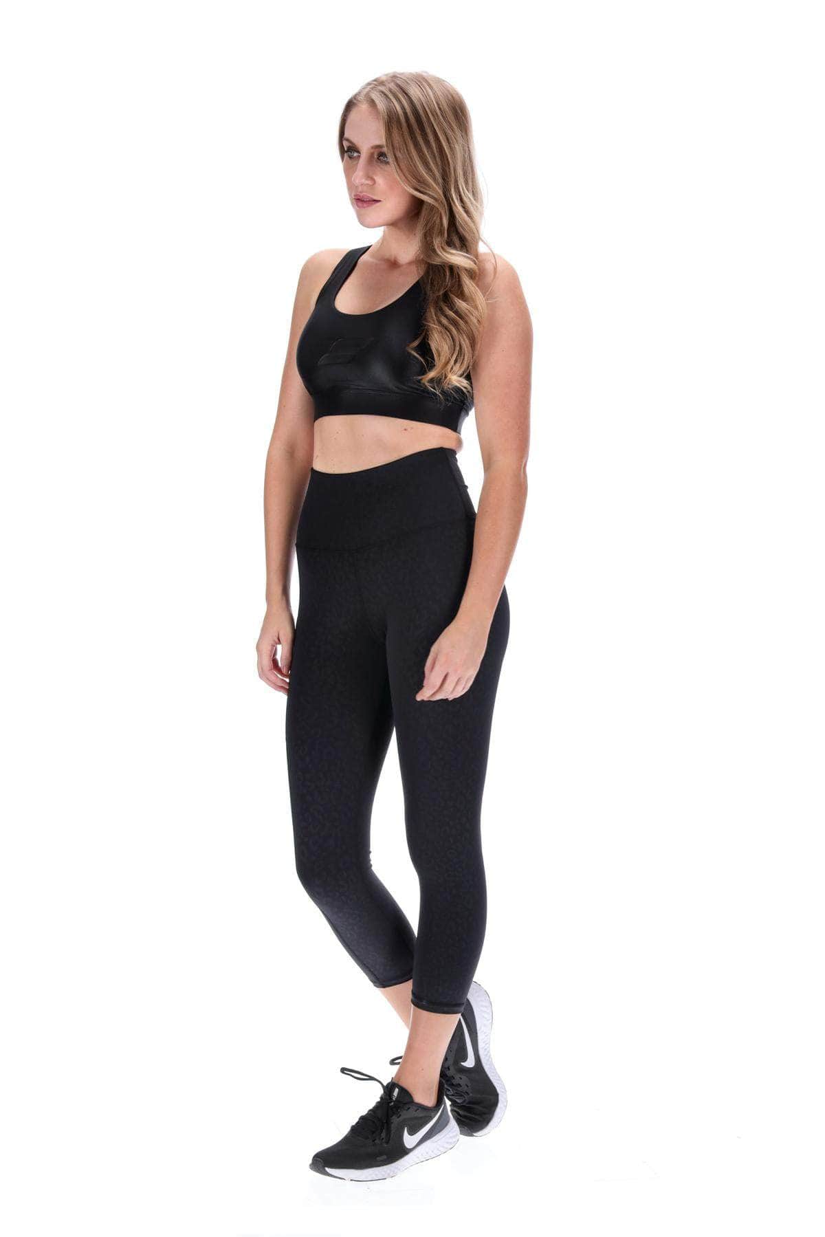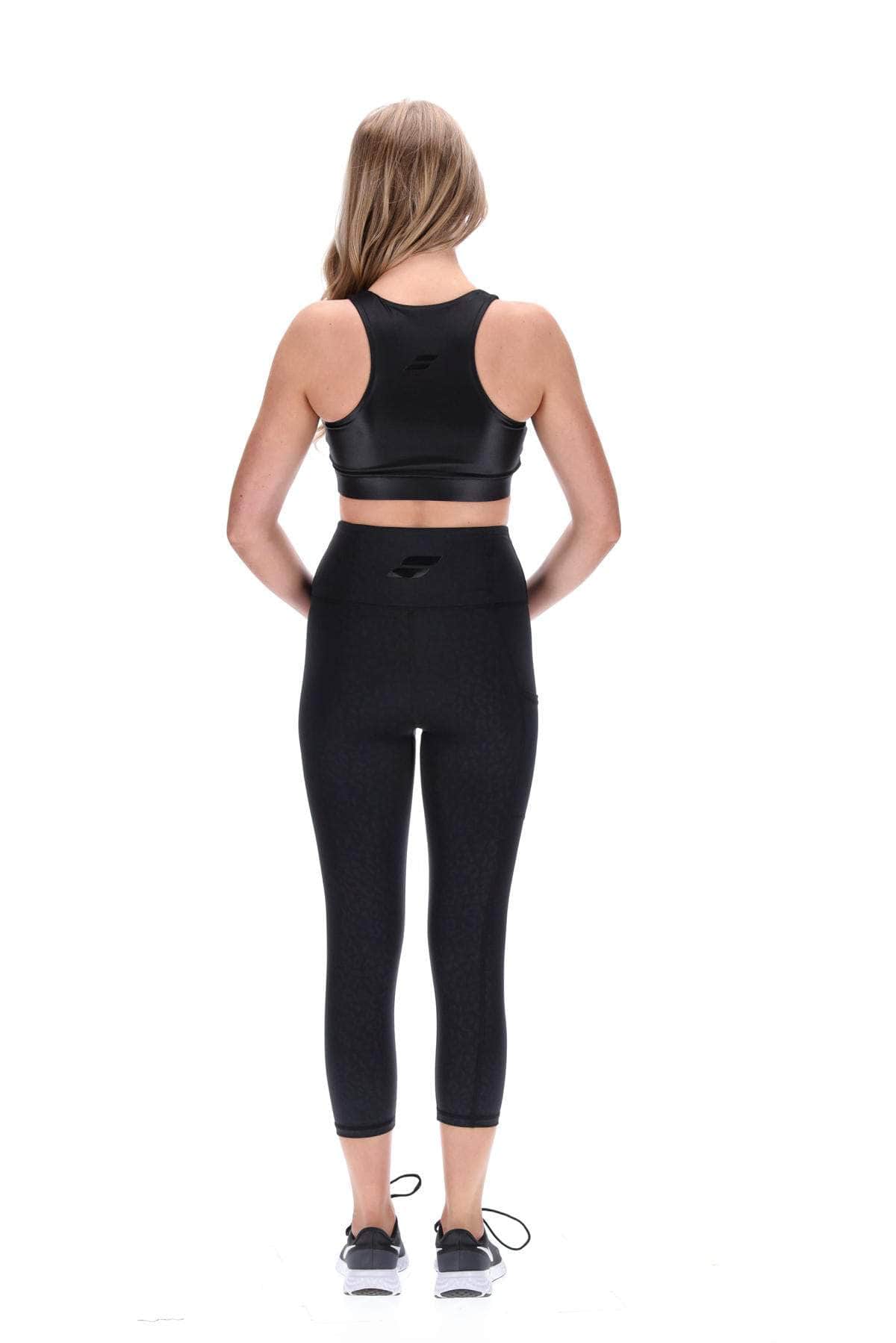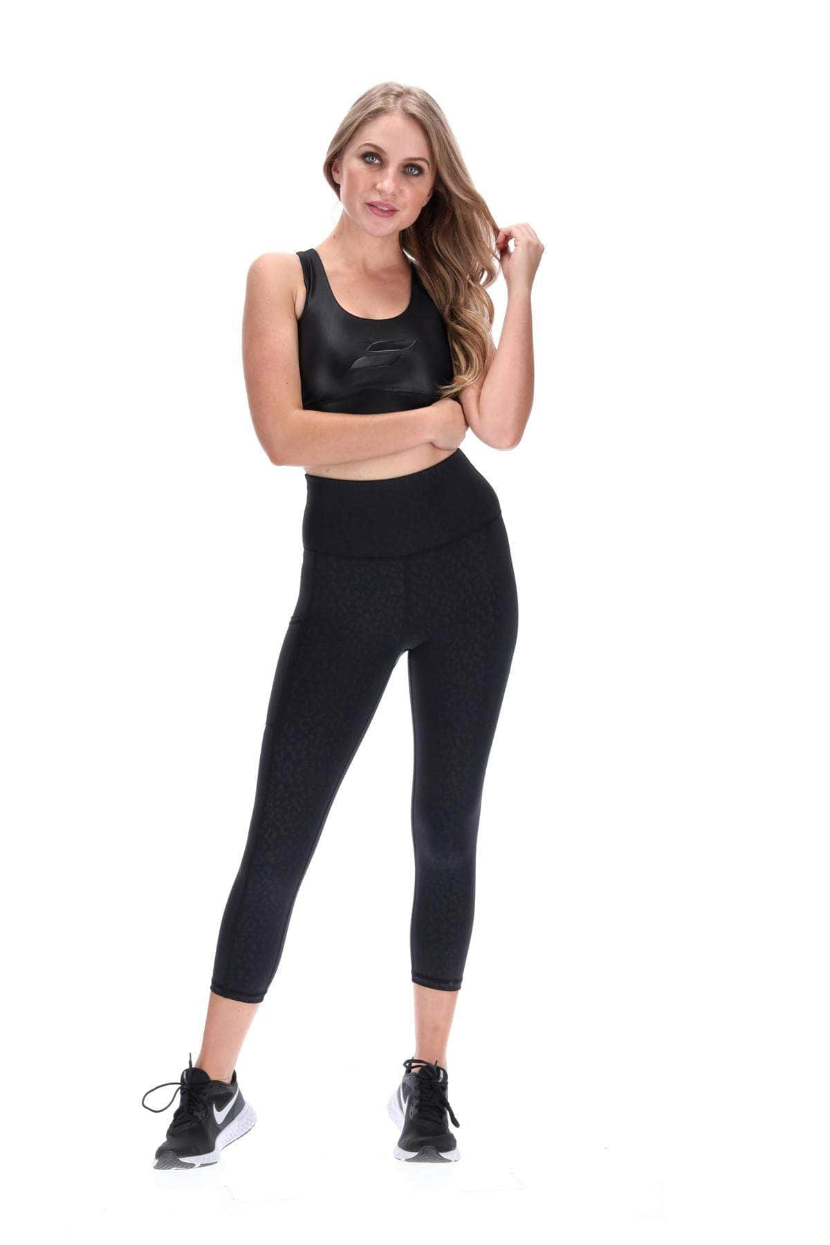 A lovely black base with leopard print sheen high waisted 7/8 legging, with a side and back waist phone pocket.