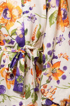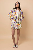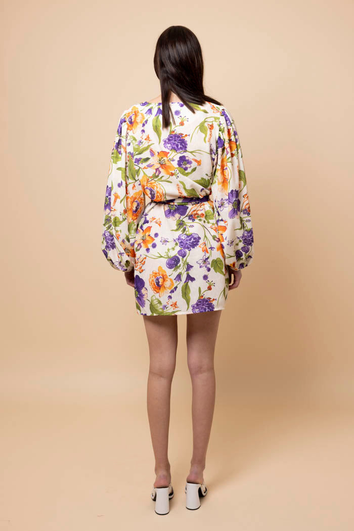 A white and purple floral mini dress.
