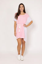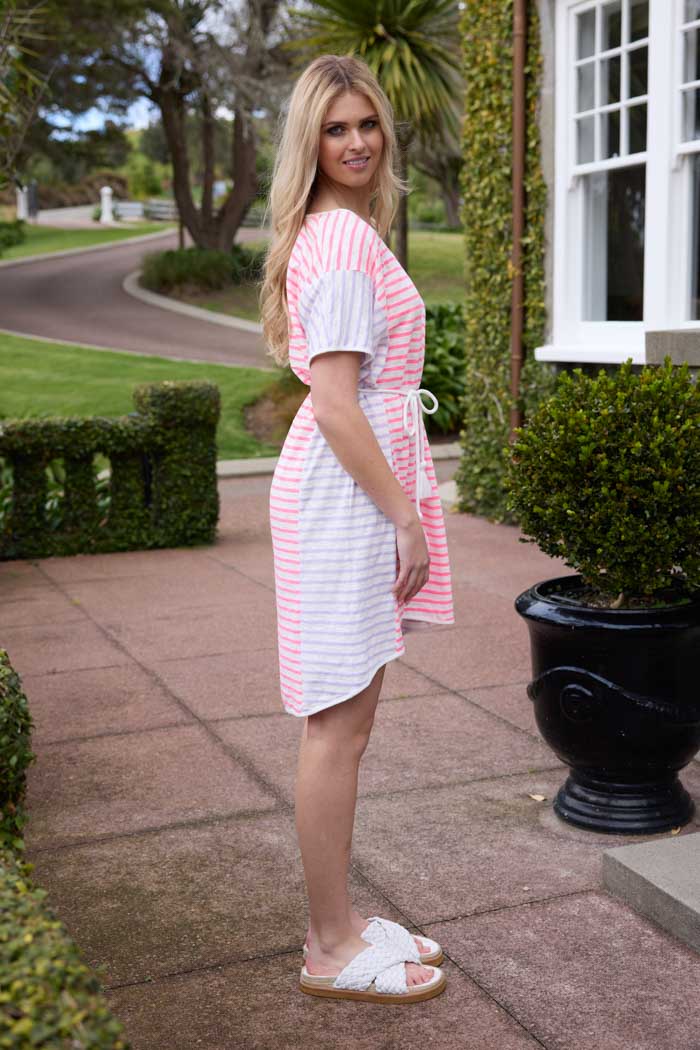 A soft pink striped t-shirt dress with rope waist tie.