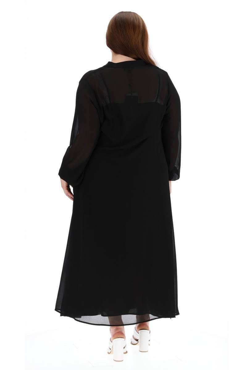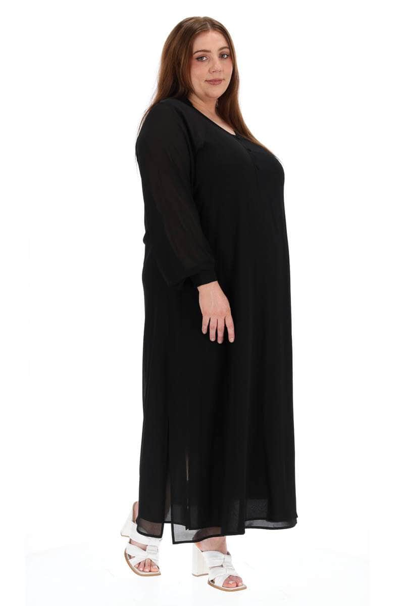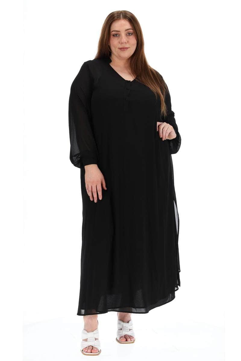 A black flowy dress with partial button placket.