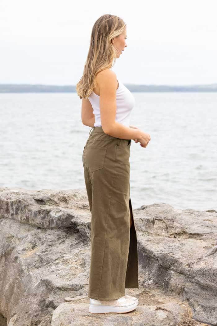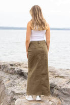 A khaki denim maxi skirt with front split.