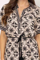 A black and beige design shirt dress style with black rope waist tie to pull in and give shape.
