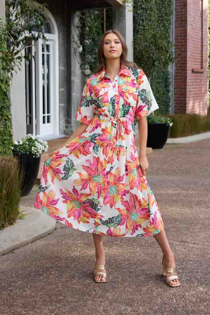A shirt dress style in a bright pink, orange and white floral.