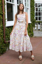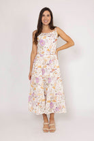 A soft white and purple floral print dress with a bow tie detail at the back.