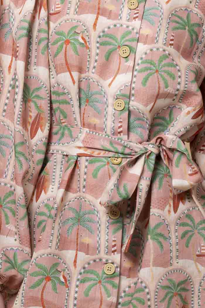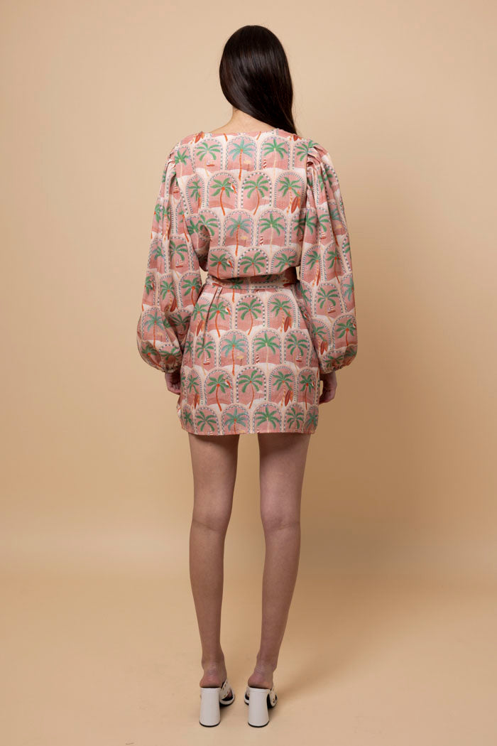 A mini dress in a palm print with a long balloon sleeve and waist tie to synch.