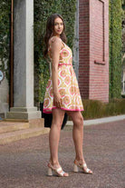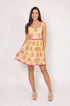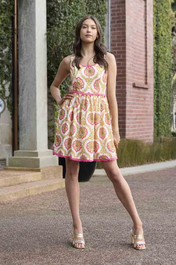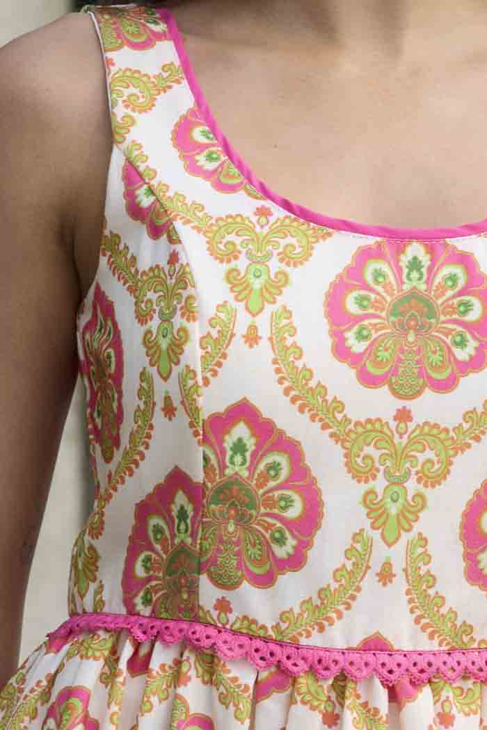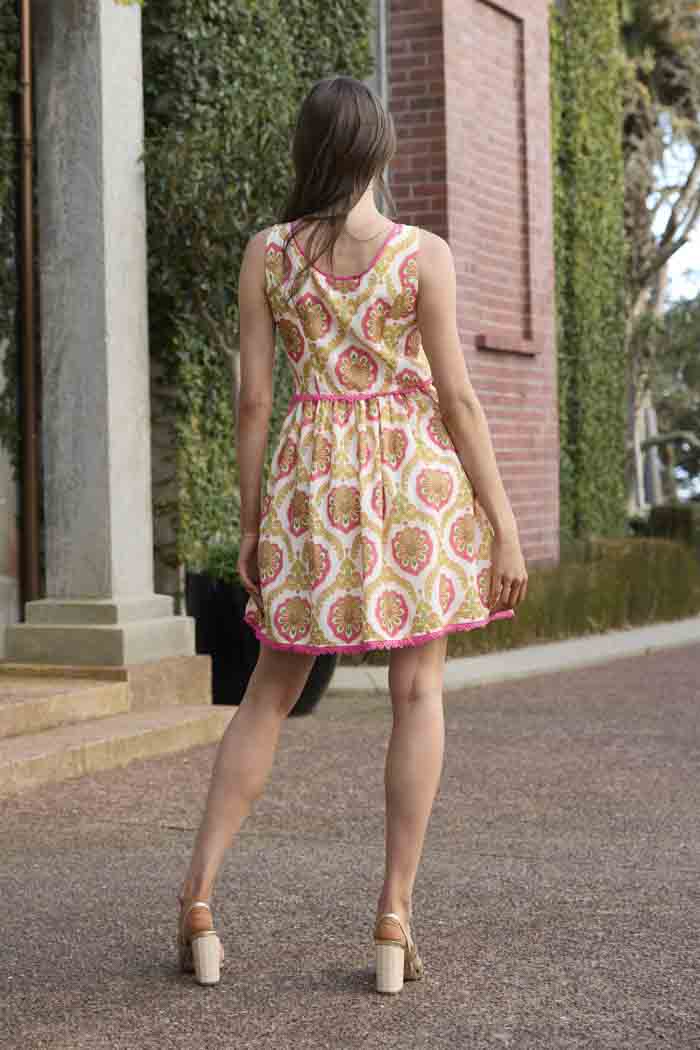 A fluro pink paisley mini dress with a cute pink waist seam.