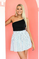 A white spot print mini skirt.