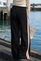 A black wide leg pant with red hearts side stripe.