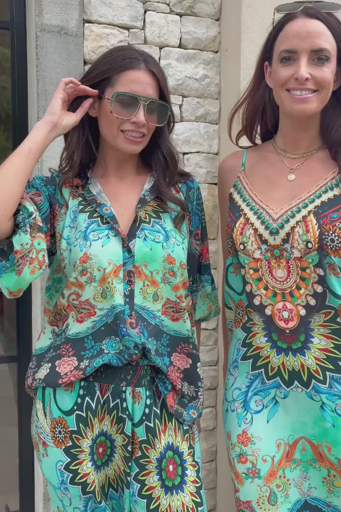 A bold green and blue print pant.