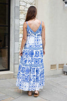 A white and blue patterned maxi dress.