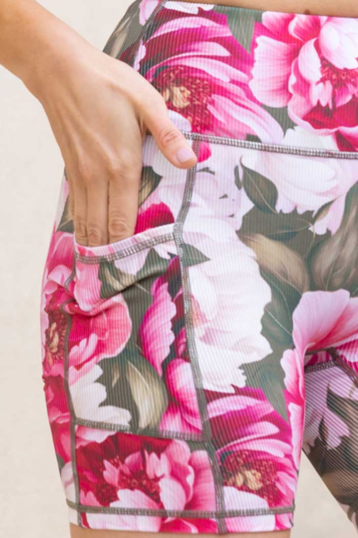 A khaki and pink floral ribbed bike short.