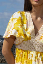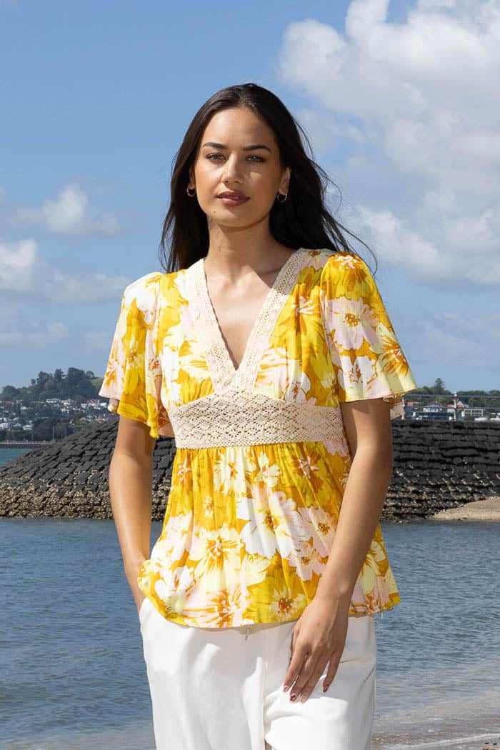 A yellow floral blouse with lace detail.