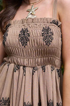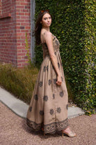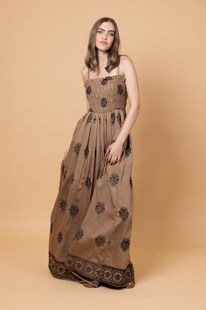 A soft caramel viscose maxi dress with a black embroidery pattern.