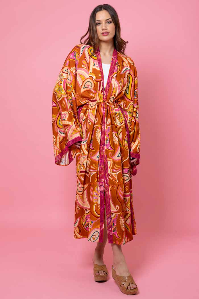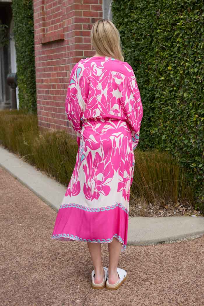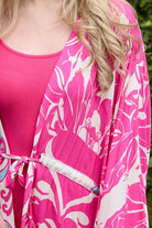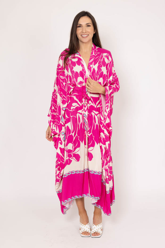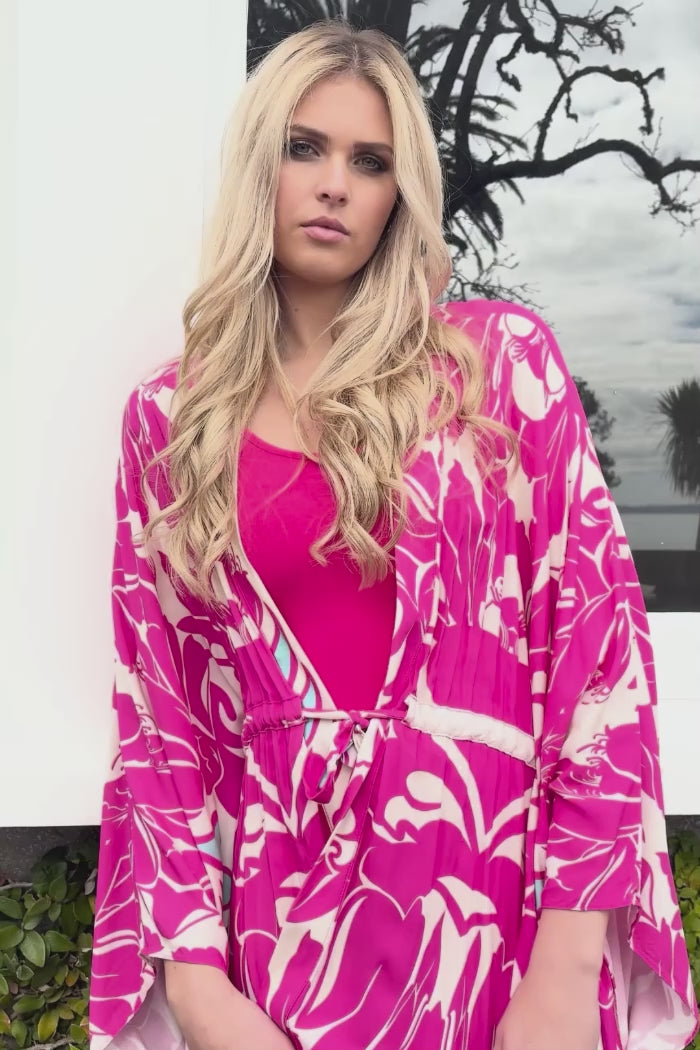 A soft viscose pink, white and blue print kimono with internal drawstring at the waist line.