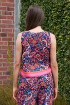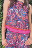 A black print bodice straight cut top with a pink and red band along the bottom.