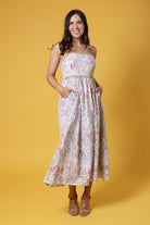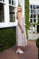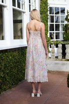 A beautiful soft pale pink and purple floral print with a white base maxi dress. Diamantes along the top and waist seam.