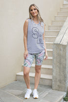 A tropical print long bike short.