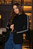 A black coloured blazer in a soft fabric with white side stripes.