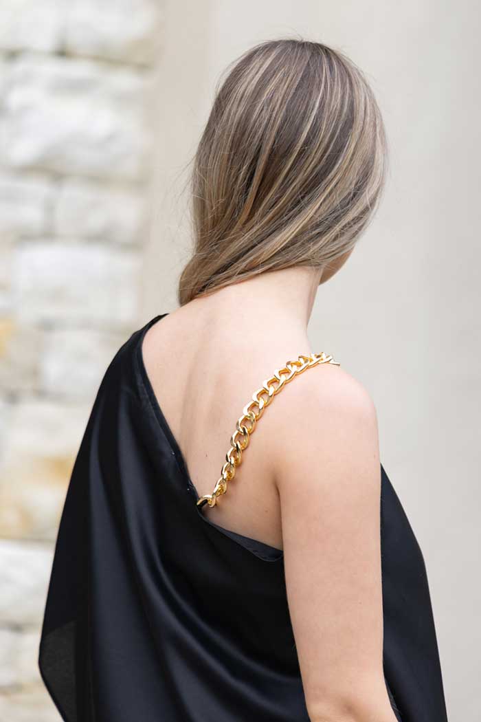A gorgeous satin black one side top with a chain strap on the other.