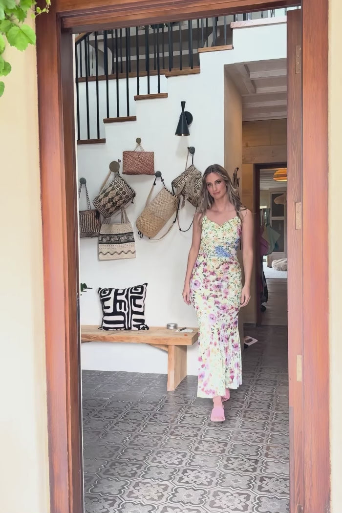 A soft green floral maxi dress.