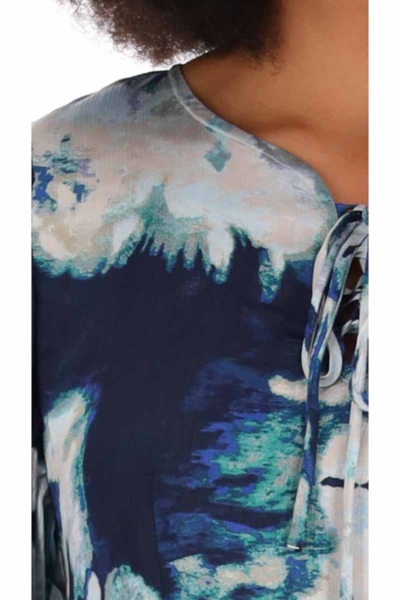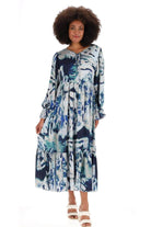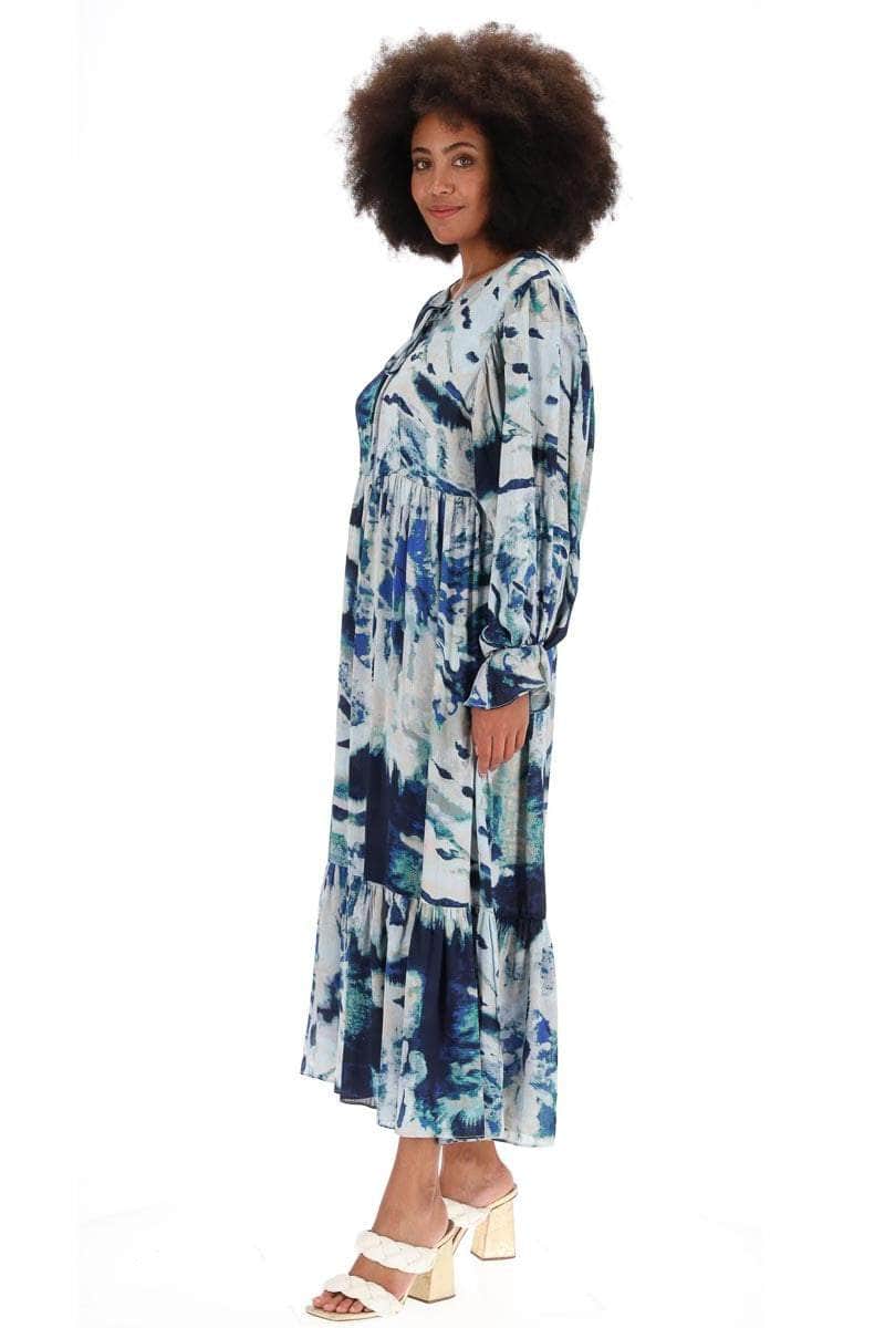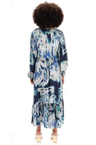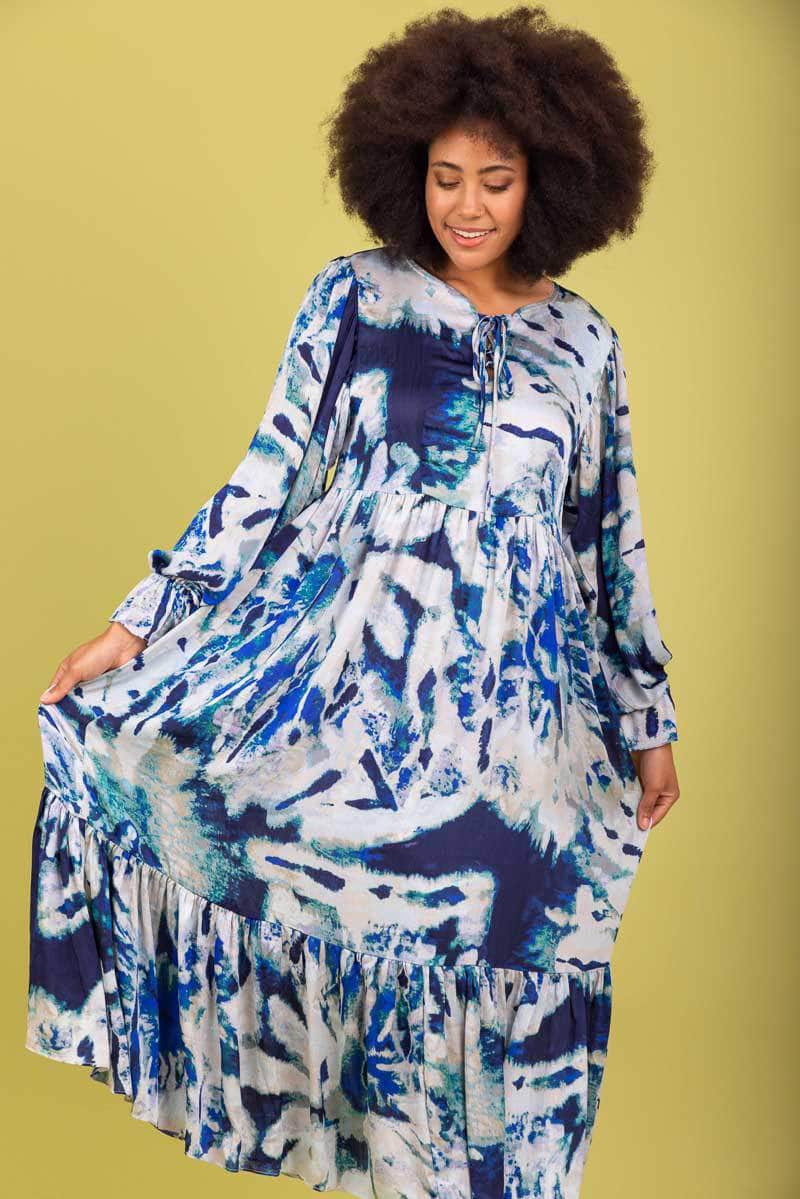 A blue & grey abstract print maxi dress.