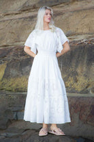 - Short raglan sleeves with embroidered eyelet lace flowers