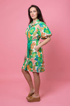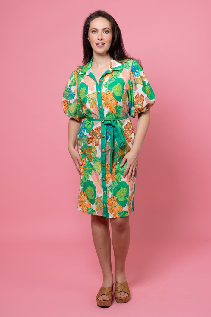 A green floral with green detail in a shirt dress style with a puff sleeve.