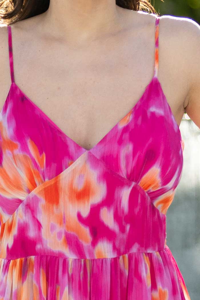 A hot pink & orange abstract tiered maxi dress.