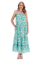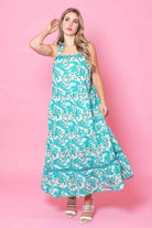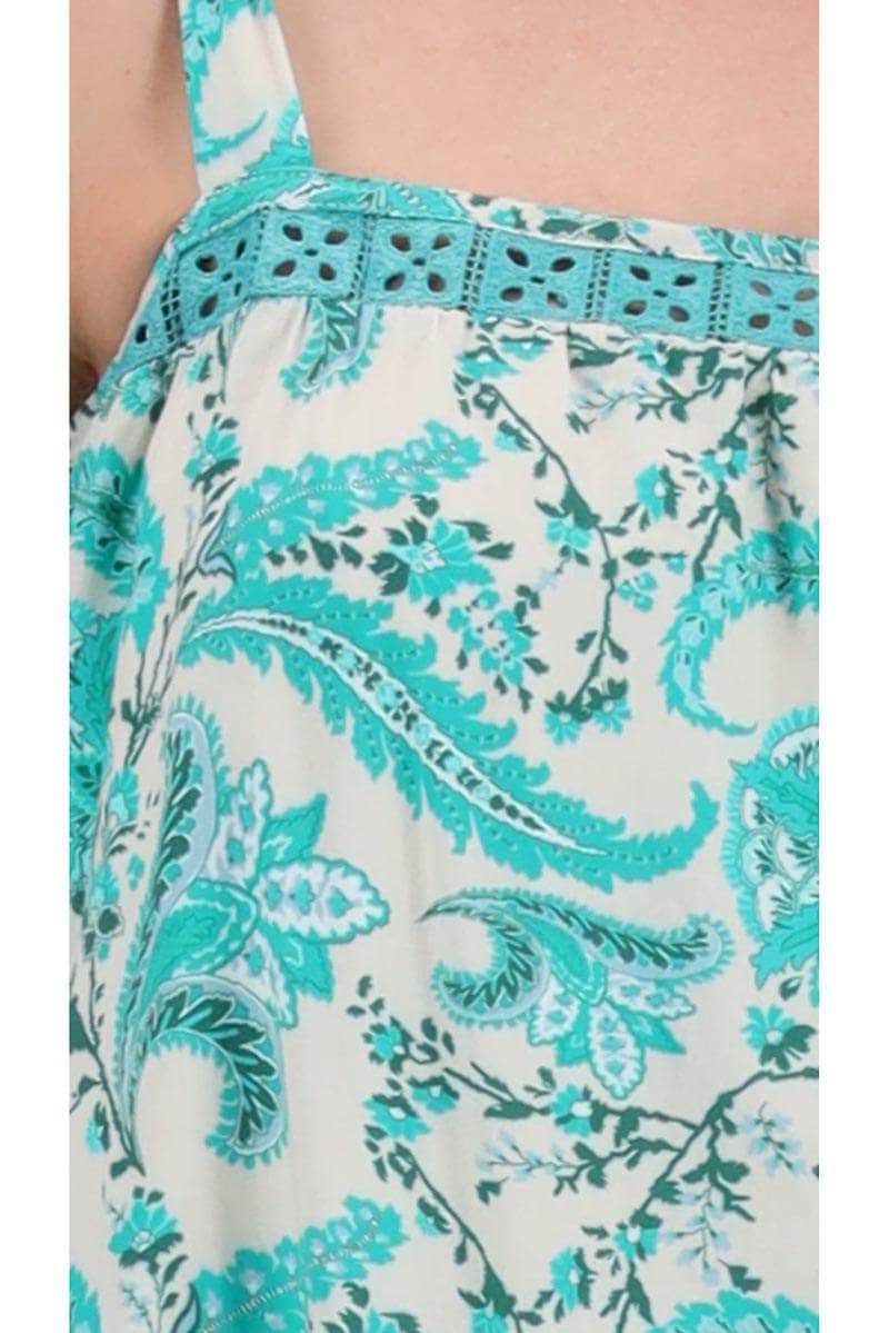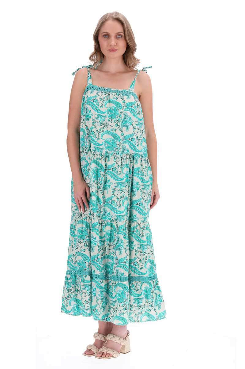 A white & teal paisley print midi dress.