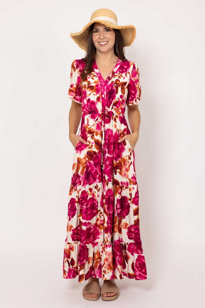 A gorgeous bright pink and rust floral maxi dress