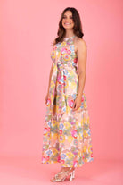 A colourful floral print halter neck maxi dress