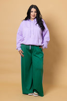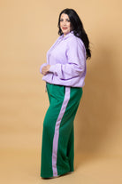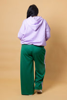 A green trackpant with lilac side stripes.